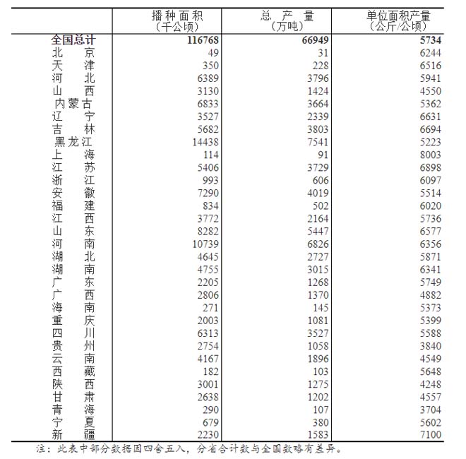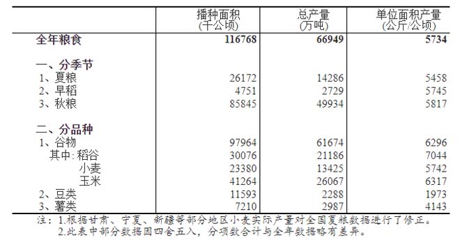 全國糧食總產量為31個省(區、市)夏糧、早稻和秋糧產量的總和。