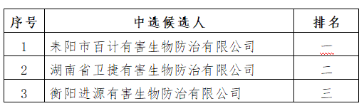 衡糧集團庫區白蟻防治服務項目(比選編號BX-015)于2025年10月20日下午14點30分進行了比選活動。經評審小組綜合評審,現將中選候選人排名結果公示如下: